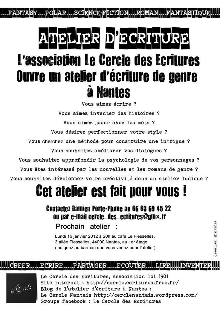 Prochain atelier nantais du Cercle des Ecritures le lundi 16 janvier 2012 à 20h au café Le Flesselles, 3 allée Flesselles , 44000 Nantes, dans la salle derrière le bar au 1er étage.