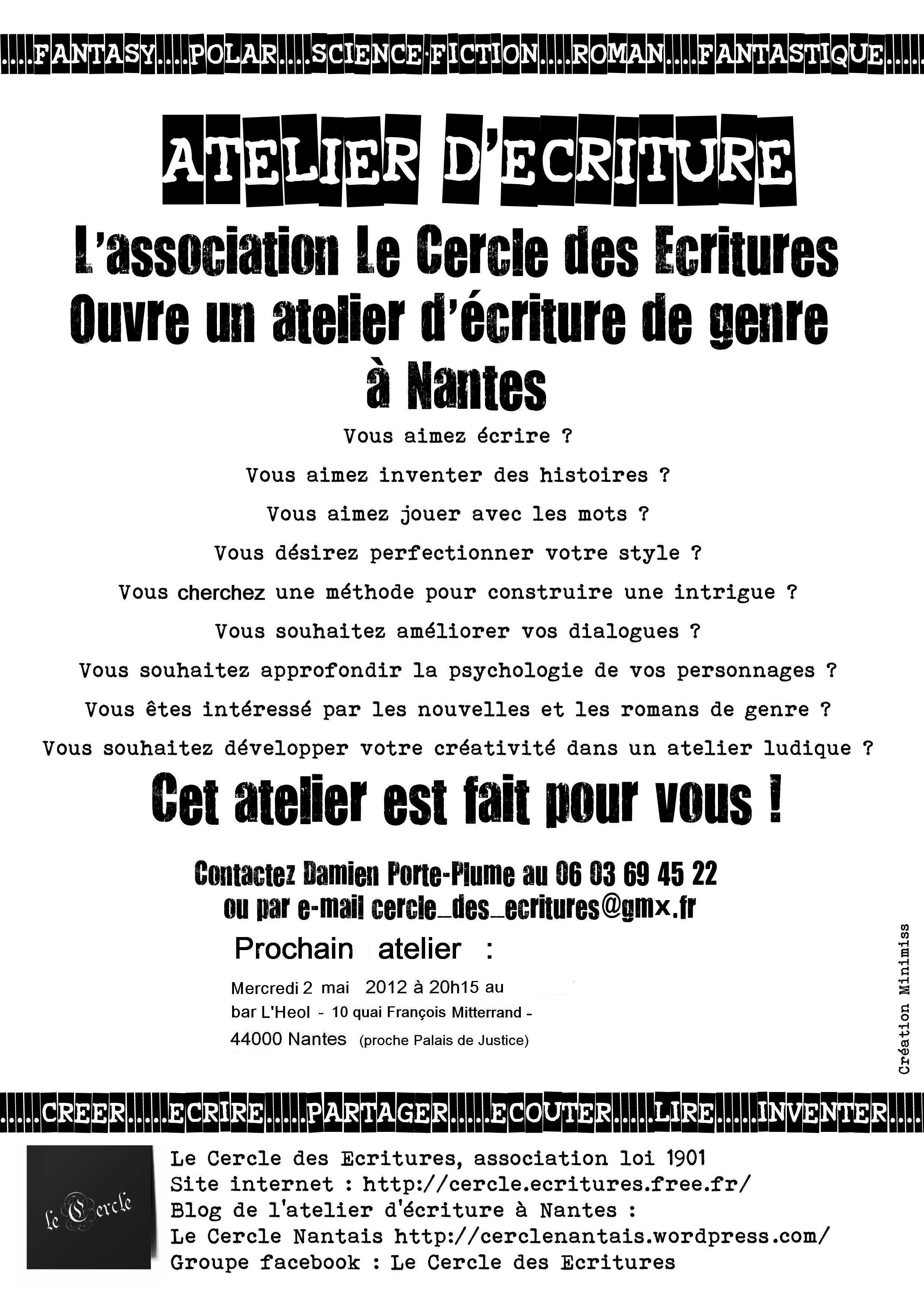 Renseignements et inscriptions : Damien Porte-Plume au 06.03.69.45.22 ou cercle_des_ecritures@gmx.fr