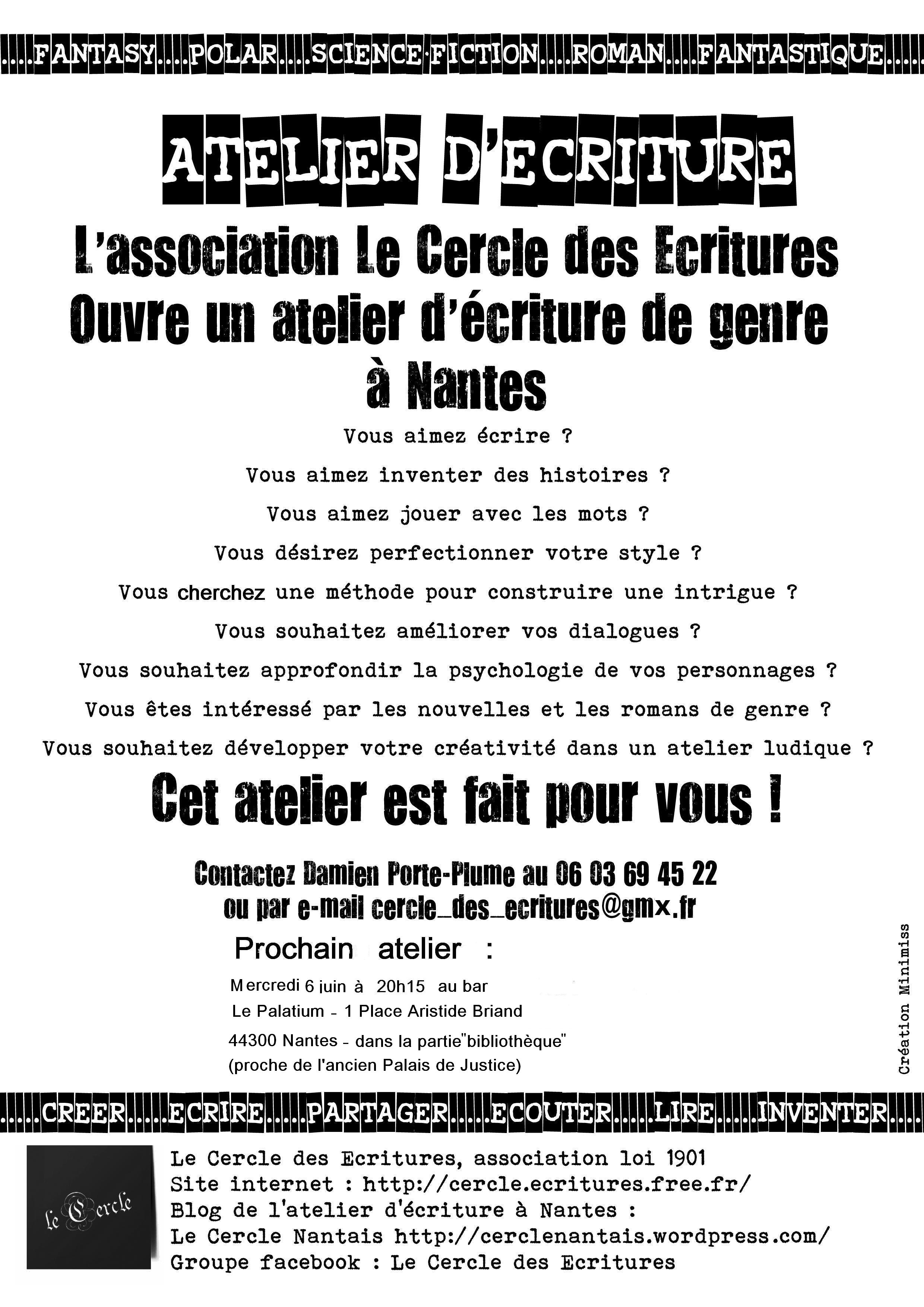 Prochain atelier nantais du Cercle des Ecritures mercredi 06 juin 2012 à 20h15 au bar Le Palatium, 1 Place Aristide Briand, 44300 Nantes (à côté de l’ancien Palais de Justice), dans la partie « bibliothèque ».