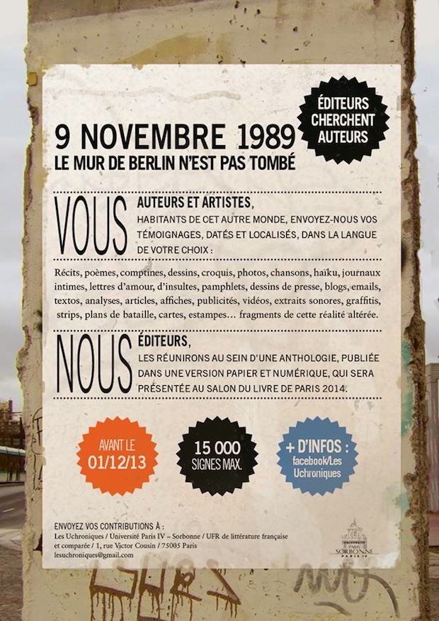 Réunis sous le nom d’Uchroniques, les 15 étudiants lancent un appel à textes, dessins, photos, emails, textos, plans de bataille…. sur le thème : « Que se serait-il passé si, le 9 novembre 1989, le Mur n’était pas tombé ? ».