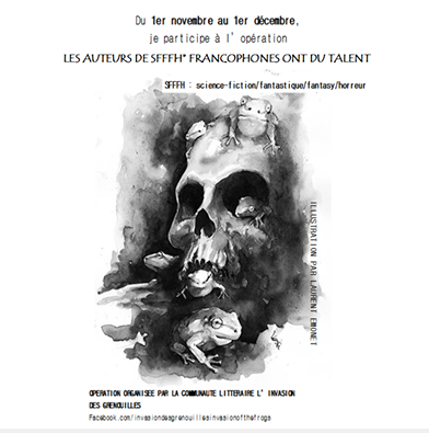 Après l’opération le 1er septembre, j’achète un ebook/livre de SFFH francophone, l’auteure franco-québecoise Gaëlle Dupille nous fait part d’une nouvelle opération littéraire organisée par Les Fossoyeurs du Rêve : « Les auteurs de science-fiction, fantasy, fantastique et horreur (SFFF) francophones ont du talent. ». Destinée à promouvoir les littératures de l’imaginaire et leurs auteurs, cette opération se déroulera du 1er novembre au 1er décembre 2014, par le biais de la communauté littéraire L’invasion des Grenouilles.