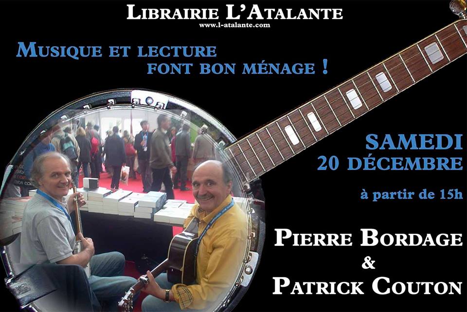 Pierre Bordage, l’auteur de la trilogie de science-fiction Les Guerriers du Silence, du cycle de fantasy historique L’enjomineur, du thriller fantastique l’Evangile du Serpent et de nombreux autres livres, Grand prix de l’imaginaire en 1993 et Grand prix Paul Féval de littérature populaire en 2000, sera le samedi 20 décembre à 15h00 à la librairie l’Atalante à Nantes pour une séance originale de dédicace en musique. On voit d’ailleurs sur la photographe Pierre Bordage tenir le banjo en compagnie du musicien Patrick Couton.
