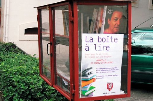 Depuis plusieurs années, on observe la multiplication des Give box, aussi appelés boîtes à lire, bibliothèques de rue, ou biblioboîtes, comme à Nantes, à Toulouse, à Bordeaux et à Rouen, à l’image des little free librairies des Anglais. Parfois mélangés à d’autres dons (jouets, vêtements…), les livres sont en libre accès, on peut prendre ou donner au choix, souvent les deux. Cette idée serait née du mouvement freegan, qui consiste à partager de la nourriture végane (ni viande ni produit animal), qui provient elle-même d’un mode de vie alternatif (entraide, gratuité) qu’on pourrait qualifier de post-soixante-huitard ou d’après-Woostock.