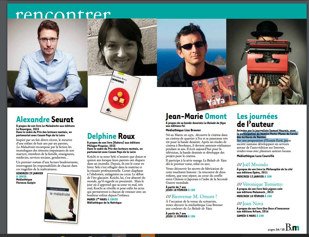 Les premières Journées de l’auteur se dérouleront les 13 janvier, 10 février et 5 mars, dans le programme de rencontres d’auteurs de l’année 2016 de la médiathèque Luce Courville (Nantes Nord). Organisé par Ecoute-Ecrit, une société spécialisée dans la promotion d’auteurs, animé par Myriam et – sur la date du 5 mars – par Damien Porte-Plume du Cercle des écritures de Nantes (tiens, tiens ! Il me dit quelque chose celui-là), ces rencontres seront l’occasion de discuter avec de nouveaux auteurs primo-édités et de découvrir leur univers.