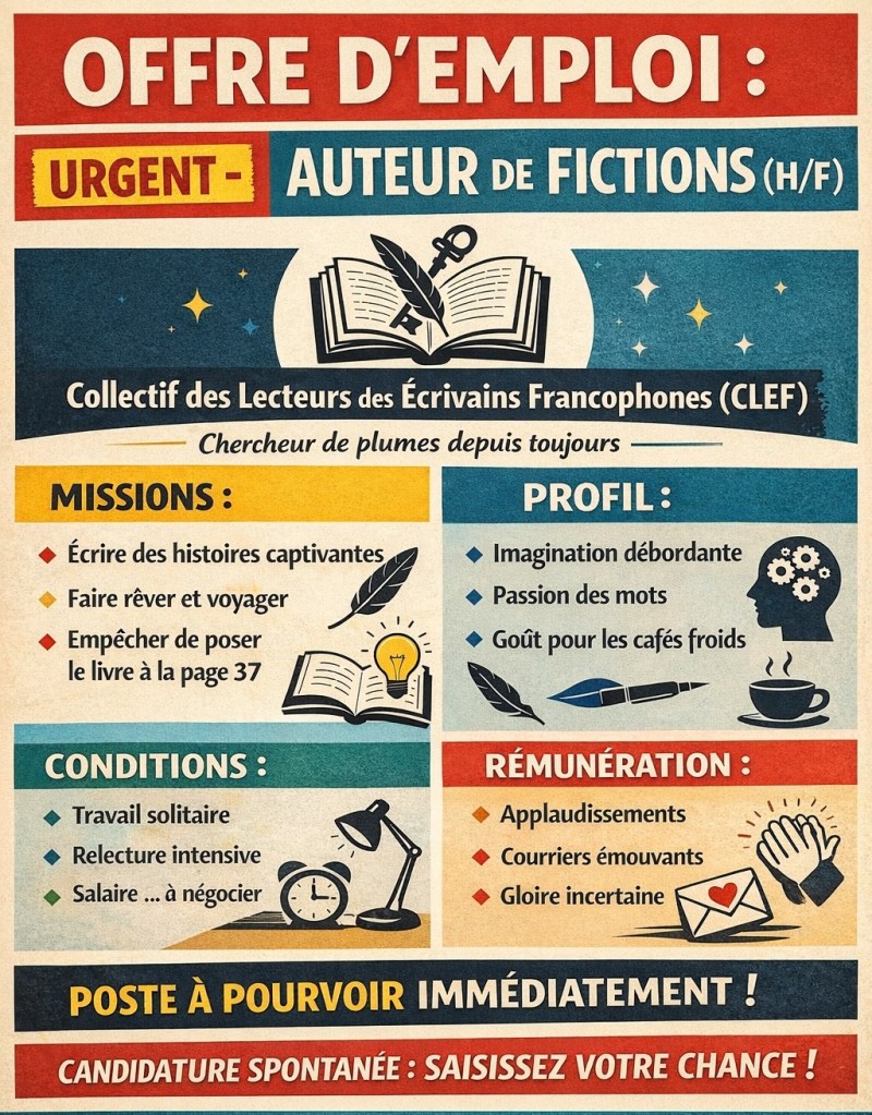 Écrivain – Auteur de fictions – Créateur de personnages et de mondes imaginaires – Romancier du dimanche qui voudrait aussi travailler la semaine (H/F)