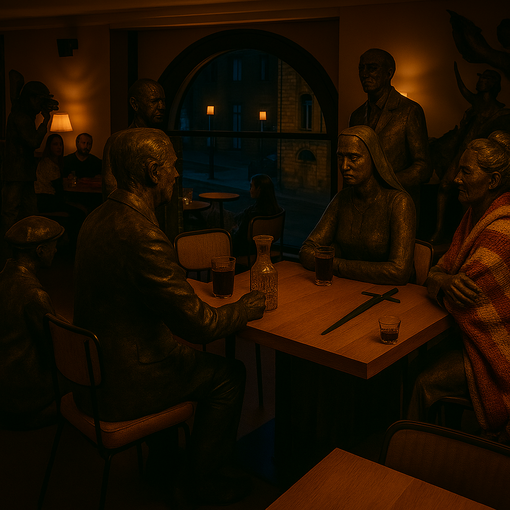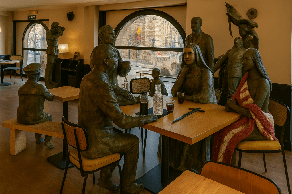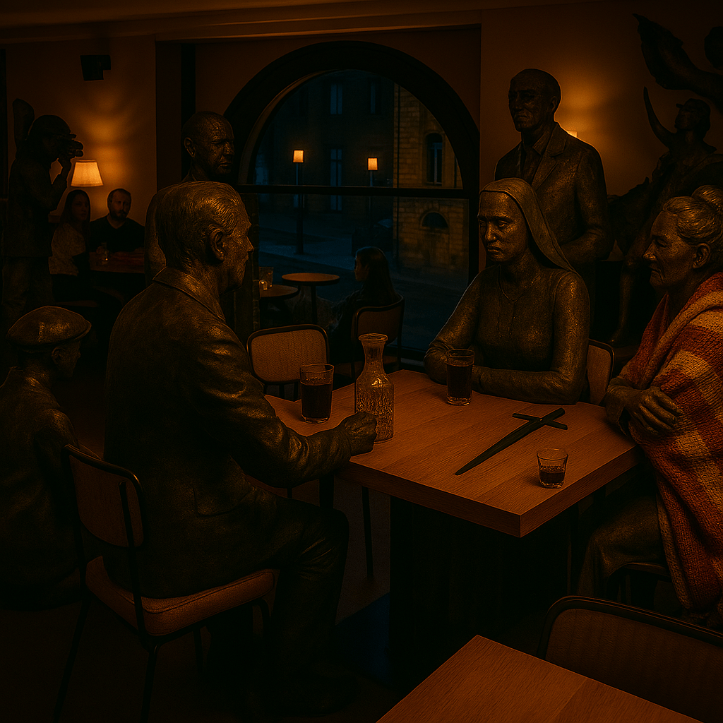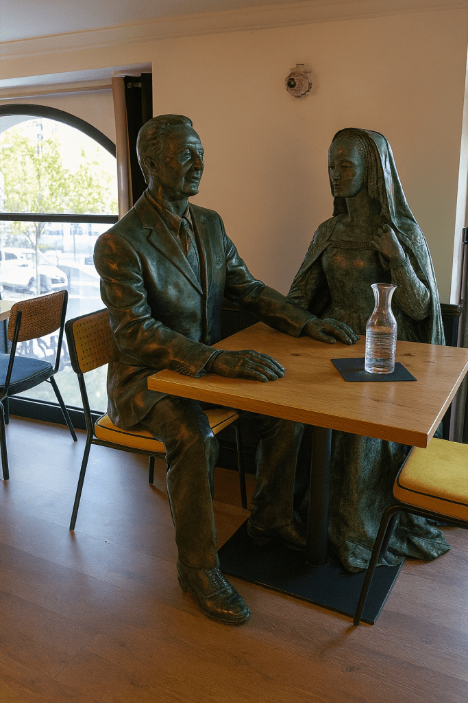 Après avoir errées quelques jours dans les rues pavées qui entourent le château, les deux statues ont convergé au restaurant Chez les Ducs. Elles se sont assises à l’étage, semblant attendre un événement dans ces lieux.