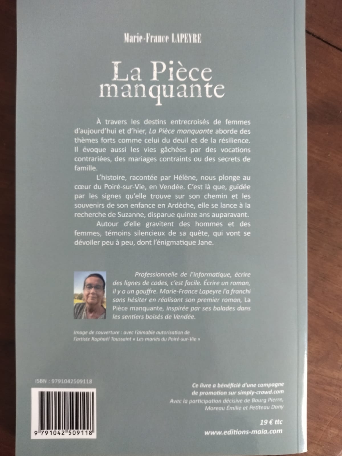 Marie-France Lapeyre a suivi notre Masterclass de création littéraire en Vendée en 2017-2018. Elle a trouvé chez les éditions Maïa une maison d’édition qui a su l’aider à promouvoir son livre. Marie-France Lapeyre est membre de la Société des écrivains de Vendée.