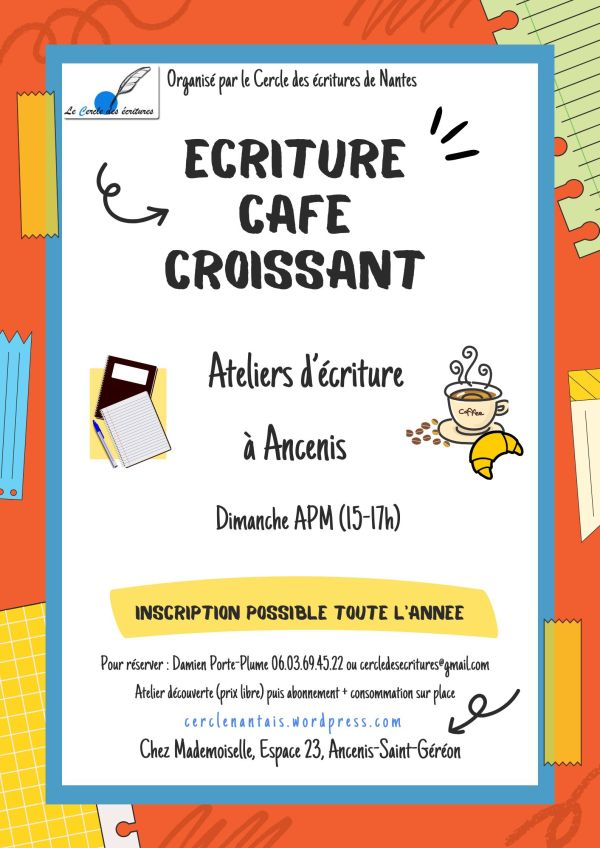 Quels chanceux ! Les habitants d'Ancenis et des environs pourront participer à notre prochain atelier d'écriture, ce dimanche 30 novembre 2025, à 15h. Toujours organisé par notre association, le Cercle des écritures de Nantes (qu'on devrait renommer de Nantes à Ancenis), cet atelier d'écriture se tient au salon de boulangerie (un mixte ente un salon... Lire la Suite →